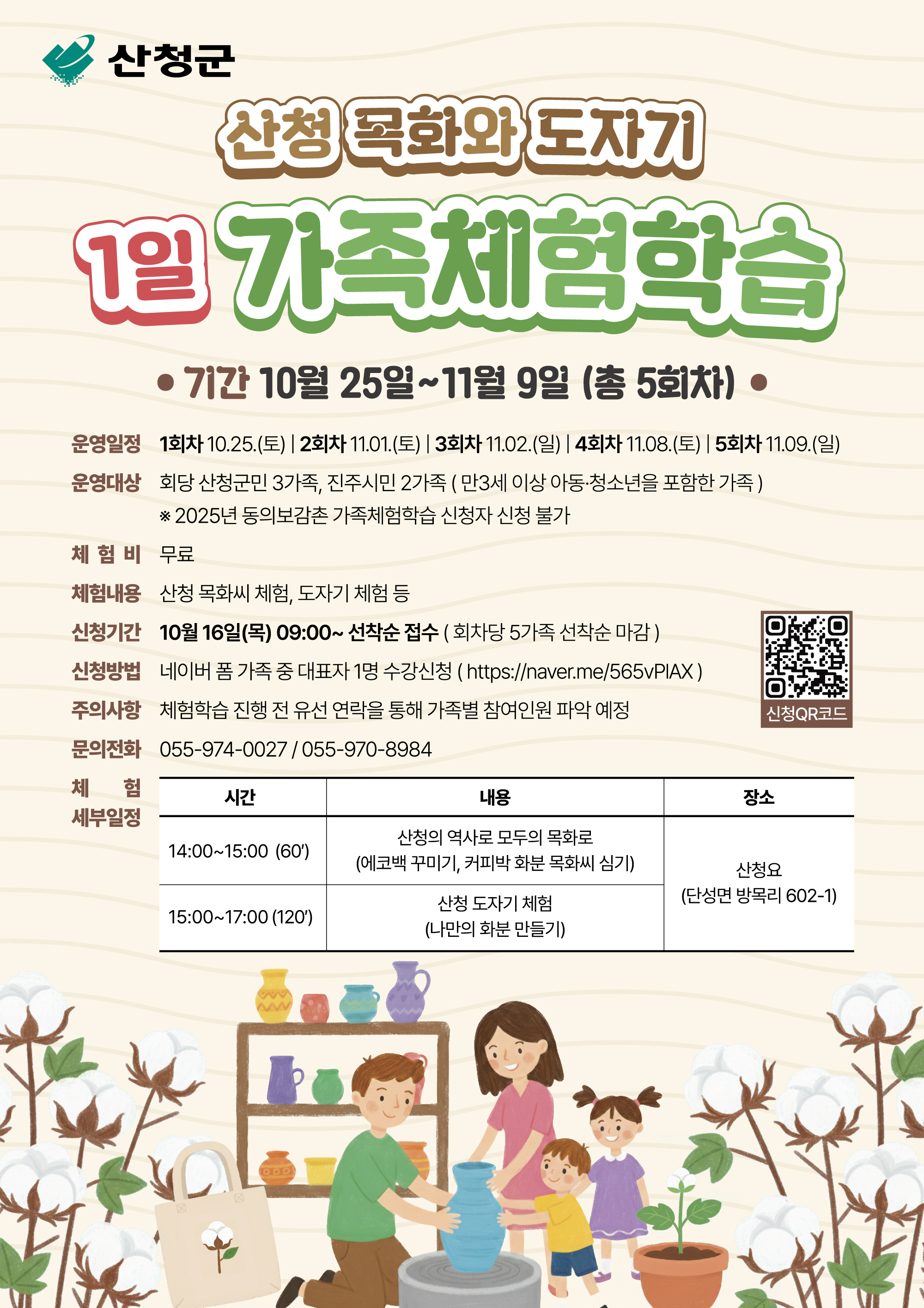 - 운영대상 : 회당 산청군민 3가족, 진주시민 2가족(청소년을 포함한 가족 / 만3세 이상 신청가능) - 체 험 비 : 무료 - 체험내용 : 산청 목화씨 심기 체험, 도자기 체험 등 아래 체험 세부일정 참고 - 신청기간 : 10월 16일(목) 09:00 ~ 선착순 접수(회차당 5가족 선착순 마감) - 신청방법 : 네이버 폼 가족 중 대표자 1명 수강신청( https://naver.me/565vPlAX ) - 참고사항 : 체험학습 진행 전 유선 연락을 통해 가족별 참여인원 파악 예정 - 문의전화 : 055-974-0027/055-970-8984 |