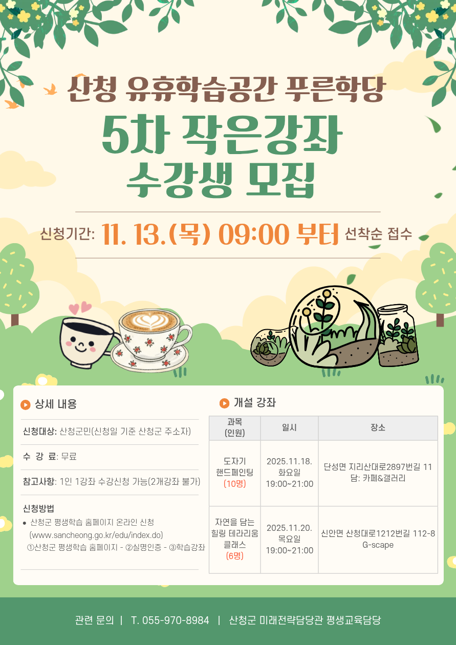 - 수강료 : 무료 - 신청기간 : 2025. 11. 13.(목) 09:00 ~ 선착순 접수 - 참고사항 : 1인 1강좌 수강신청 가능 - 신청방법 : 산청군 평생학습 홈페이지 온라인 신청(www.sancheong.go.kr/edu/index.do) - 교육문의 : 산청군 미래전략담당관(☎055-970-8984) |