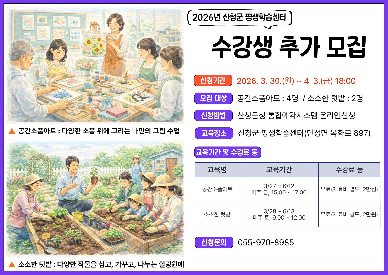 | 제목 | [미래전략담당관] 산청군평생학습센터 [공간소품아트],[소소한 텃밭] 수강생 추가모집 안내 |