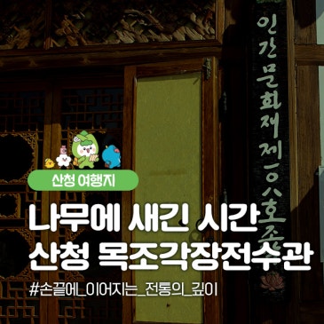 경남 산청 문화여행 스팟 나무에 시간을 새기다 목조각장전수관 안녕하세요, 산청군 공식 블로그 지기입니다 산청 여행을 하다 보면 지역이 품은 전통이 유난히 깊게 느껴지는 순간이 있습니다. 오늘은 그 전통을 더 깊이 느껴볼 수 있는 공간, 산청군 생초면에 자리한 목조각장전수관을 소개해 드릴게요. 전통을 잇는 공간, 목조각장전수관 경남 산청군 생초면 산수로 1064 이용시간 :10:00~17:00 (12:00 13:00 점심시간) ※ 마감 30분 전까지 입장 가능 쉬는날 : 매주 월요일, 설/추석 당일 이용요금 : 무료 이곳은 ‘국가무형유산 제108호 목조각장 목아 박찬수’의 기능과 정신을 계승하기 위해 2011년 10월 28일 건립된 전수·전시 공간.......